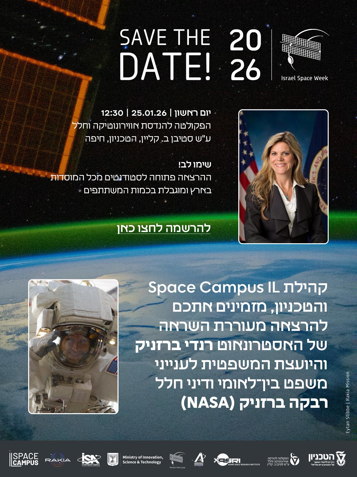 אנחנו פותחים את השבוע באירוע חגיגי עם אורחים שלא פוגשים כל יום: 👨‍🚀 האסטרונאוט רנדי ברזניק (Randy Bresnik) מגיע לביקור נדיר! ⚖️ ולצידו, היועצת המשפטית של נאס"א לענייני משפט בינלאומי ודיני חלל, בהרצאה מרתקת על העתיד של האנושות מחוץ לכדור הארץ.