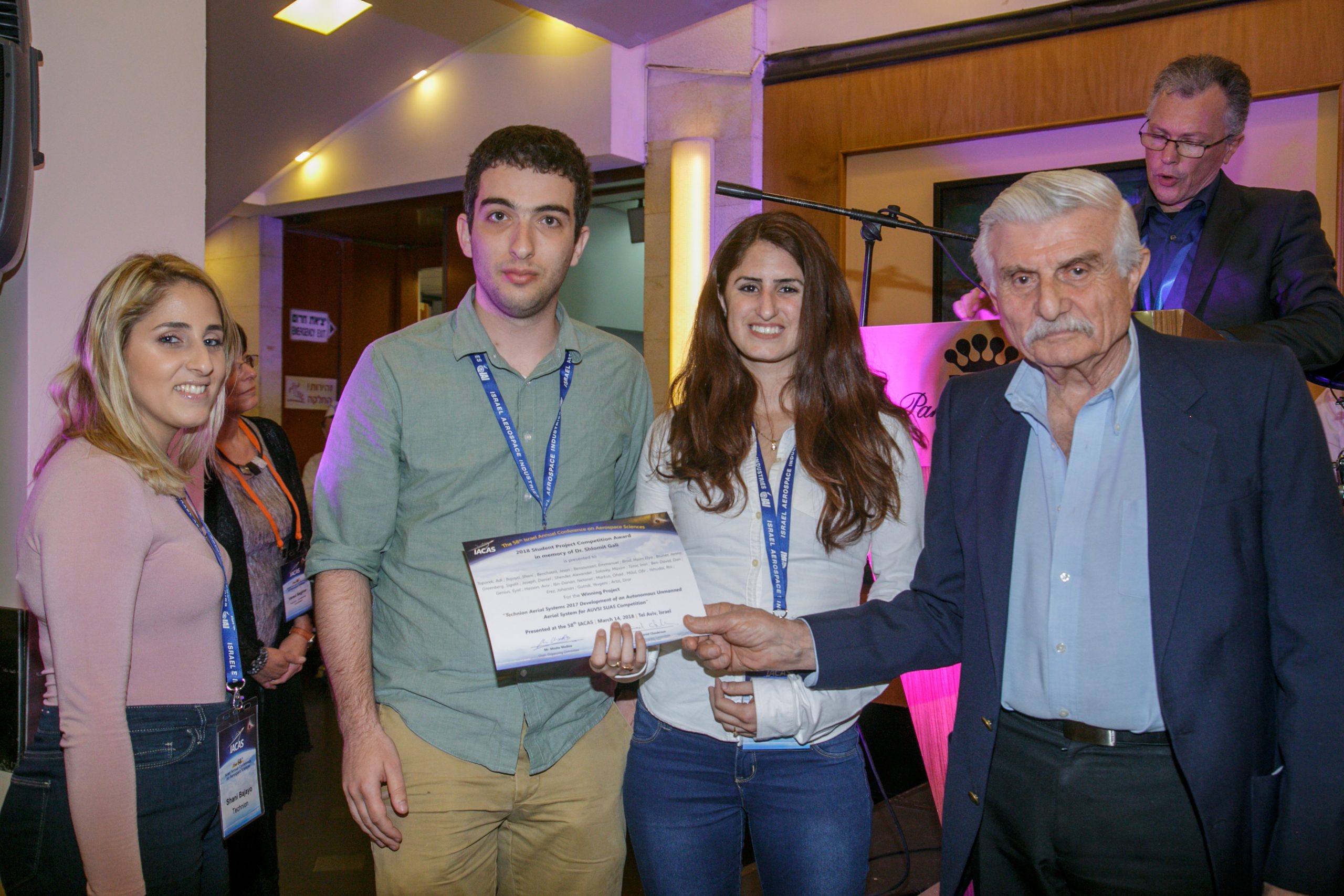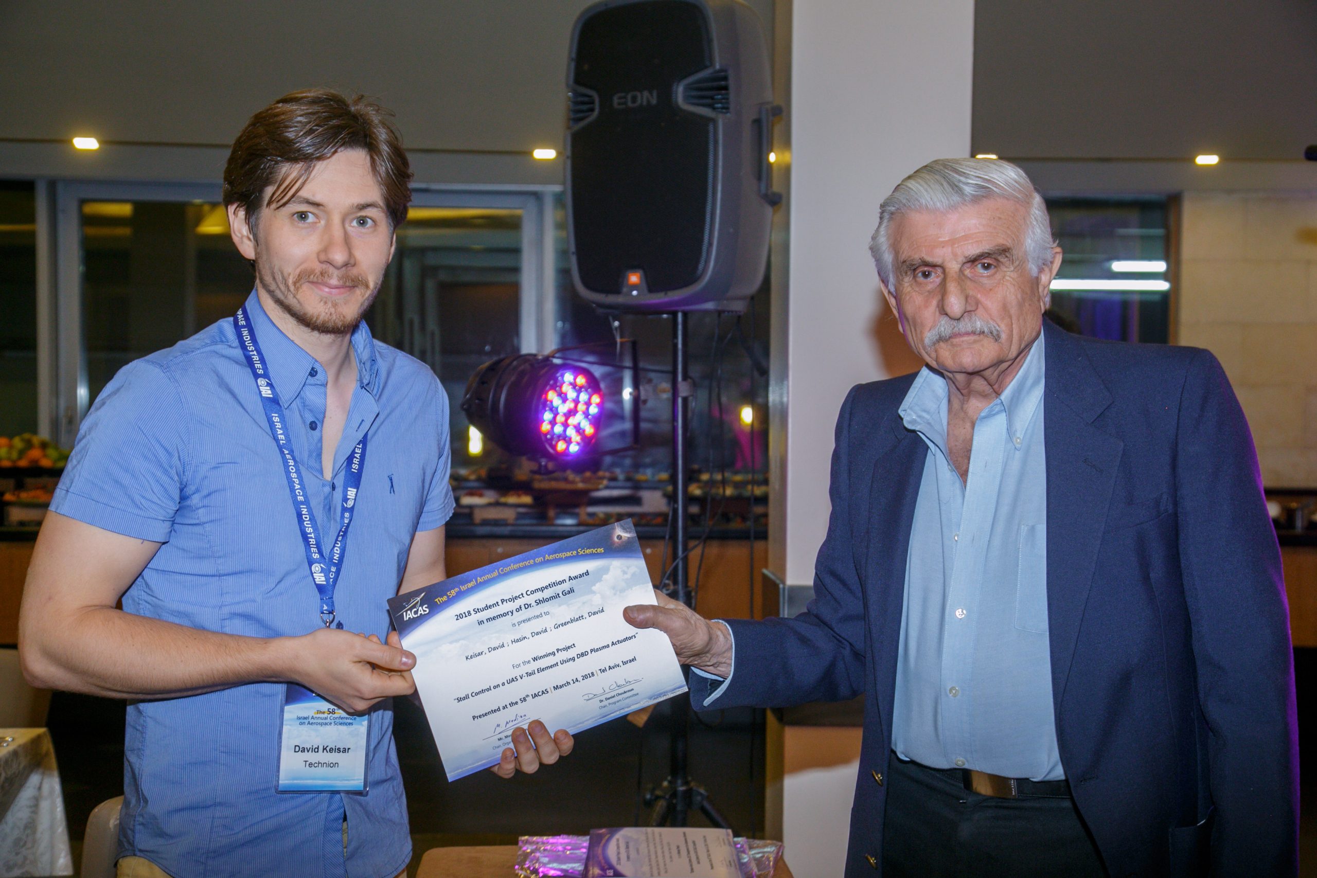 Every year, the conference gives platform for students to present their projects in a student-project competition. Prizes are awarded in two categories – Research/Experimental project and Design project. This year’s prizes were awarded ro David Kaiser of the Faculty of Mechanical Engineering (under the supervision of Prof. David Greenblatt) for his Research project; and to a joint team of students from the Faculty of Aerospace Engineering and the Viterbi Faculty of Electrical Engineering (supervised by Dror Artzi) for their Design project.